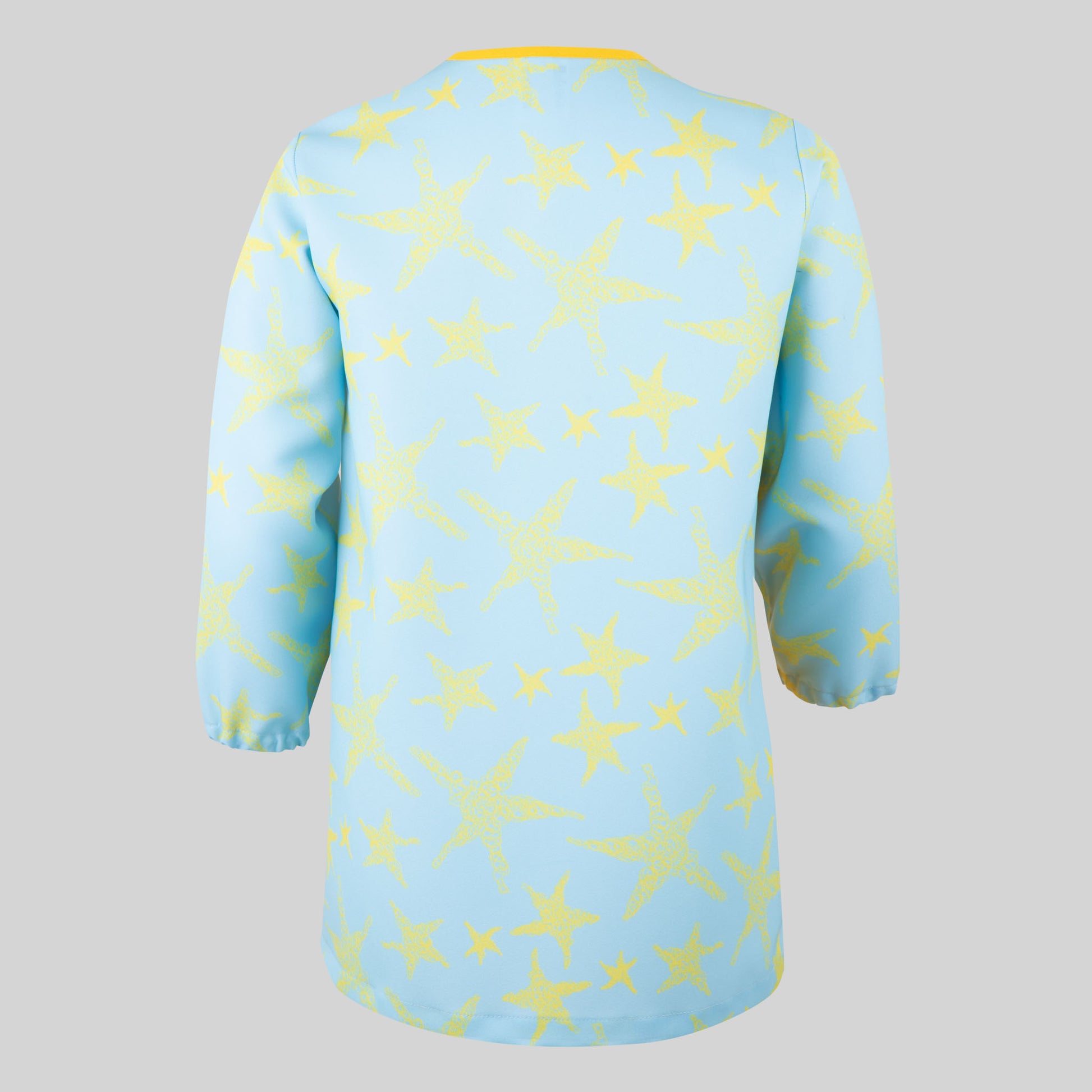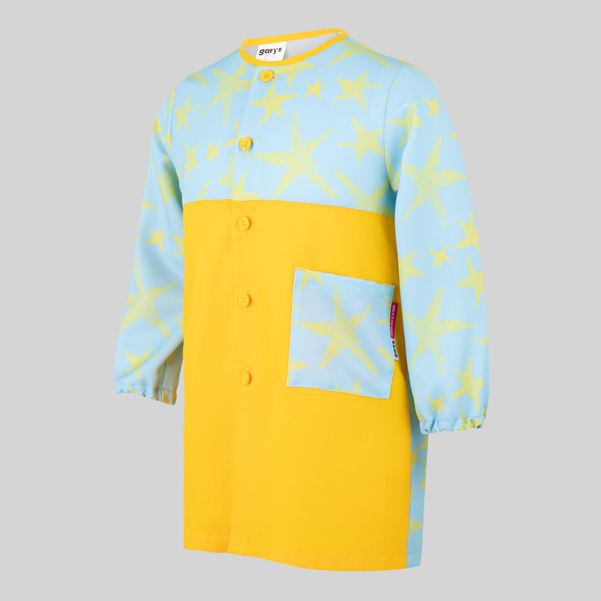Descubre la magia del Babi Lucero Agatha, una elección vibrante y cómoda para los más pequeños en su jornada escolar. Este babi, diseñado con el sello inconfundible de Agatha Ruiz de la Prada, fusiona la elegancia del uniforme colegial con un toque de diversión. Presenta un encantador estampado de estrellas amarillas sobre fondo azul en la parte superior, las mangas y el bolsillo frontal, contrastando con el tejido liso amarillo en el resto del babi.