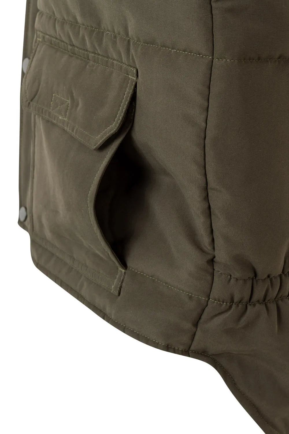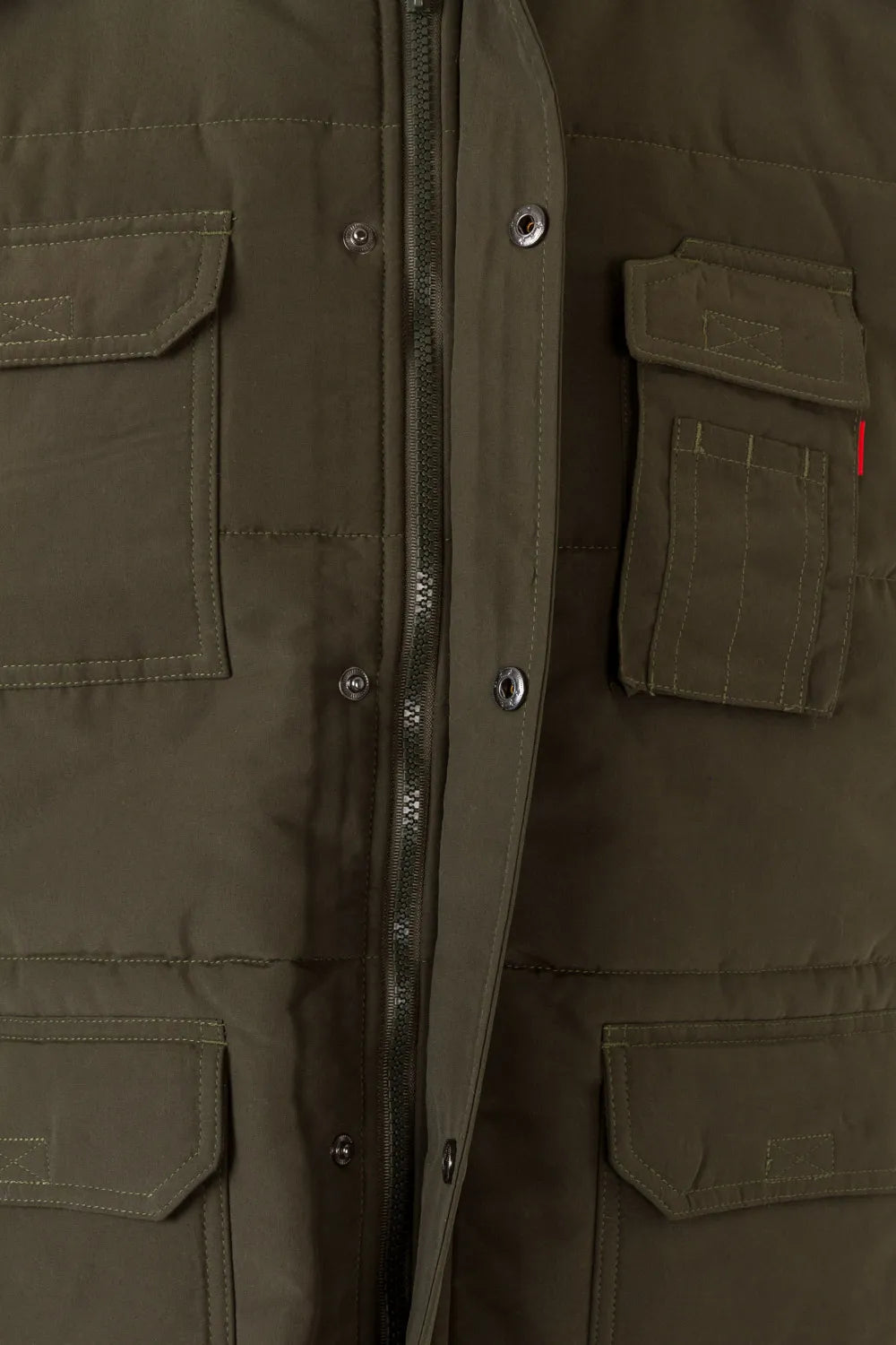 2 bolsillos inferiores de parche, con tapeta y velcro. Debajo de cada uno, 2 bolsillos laterales