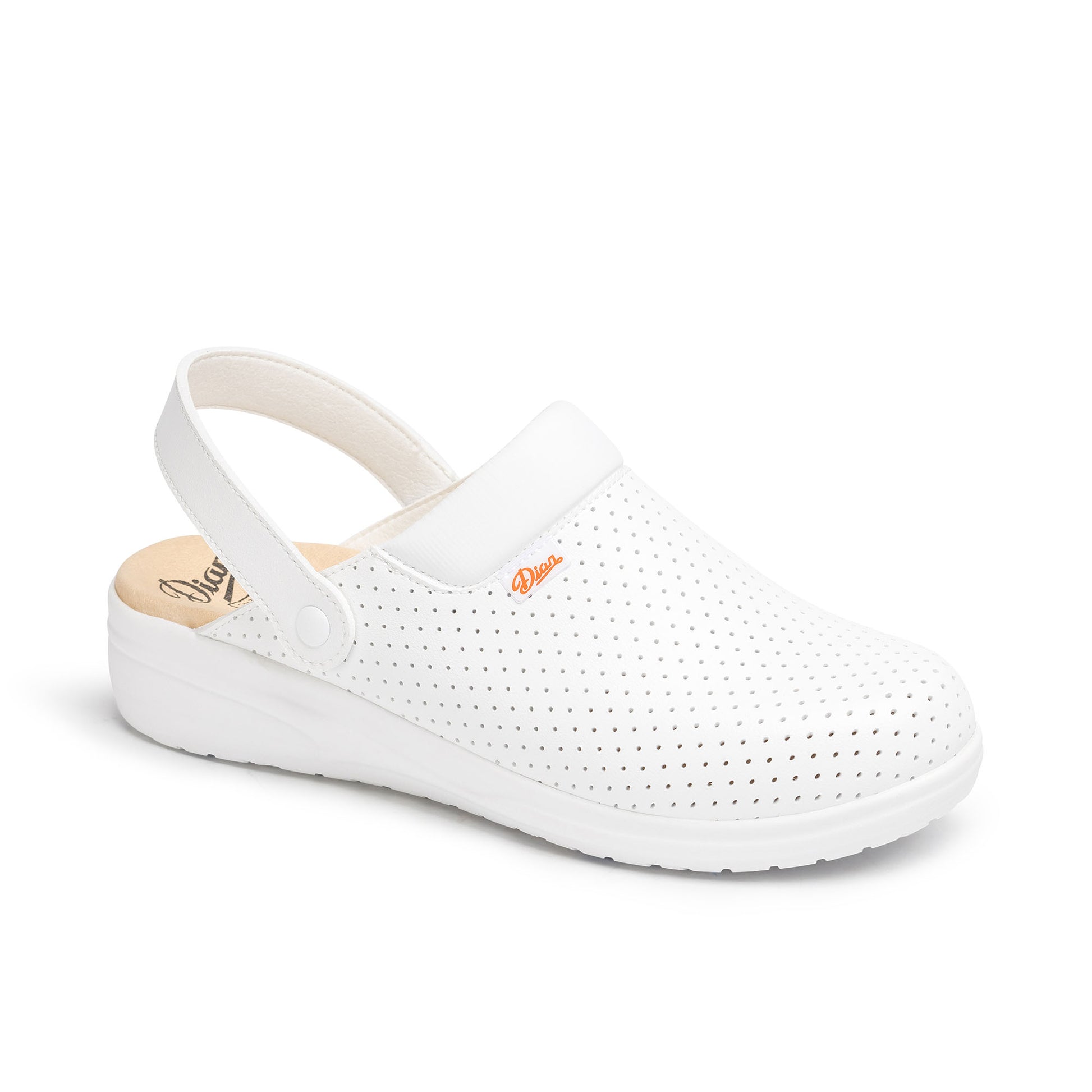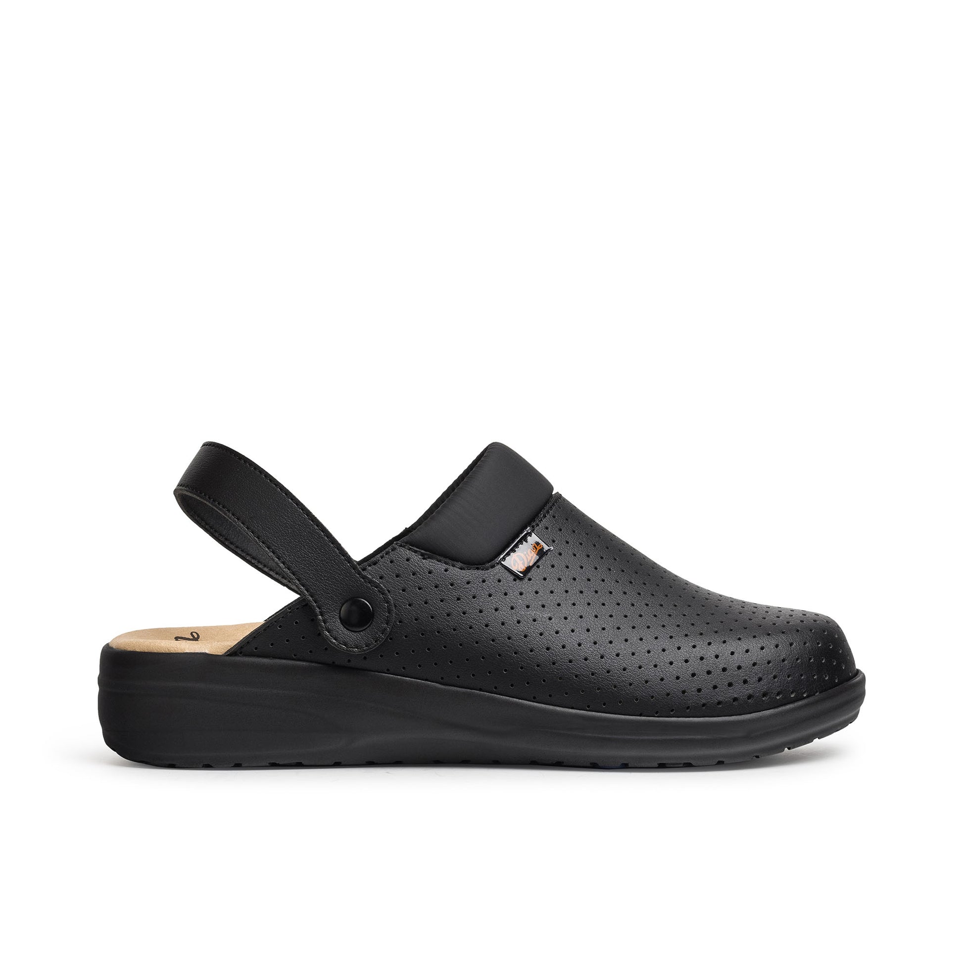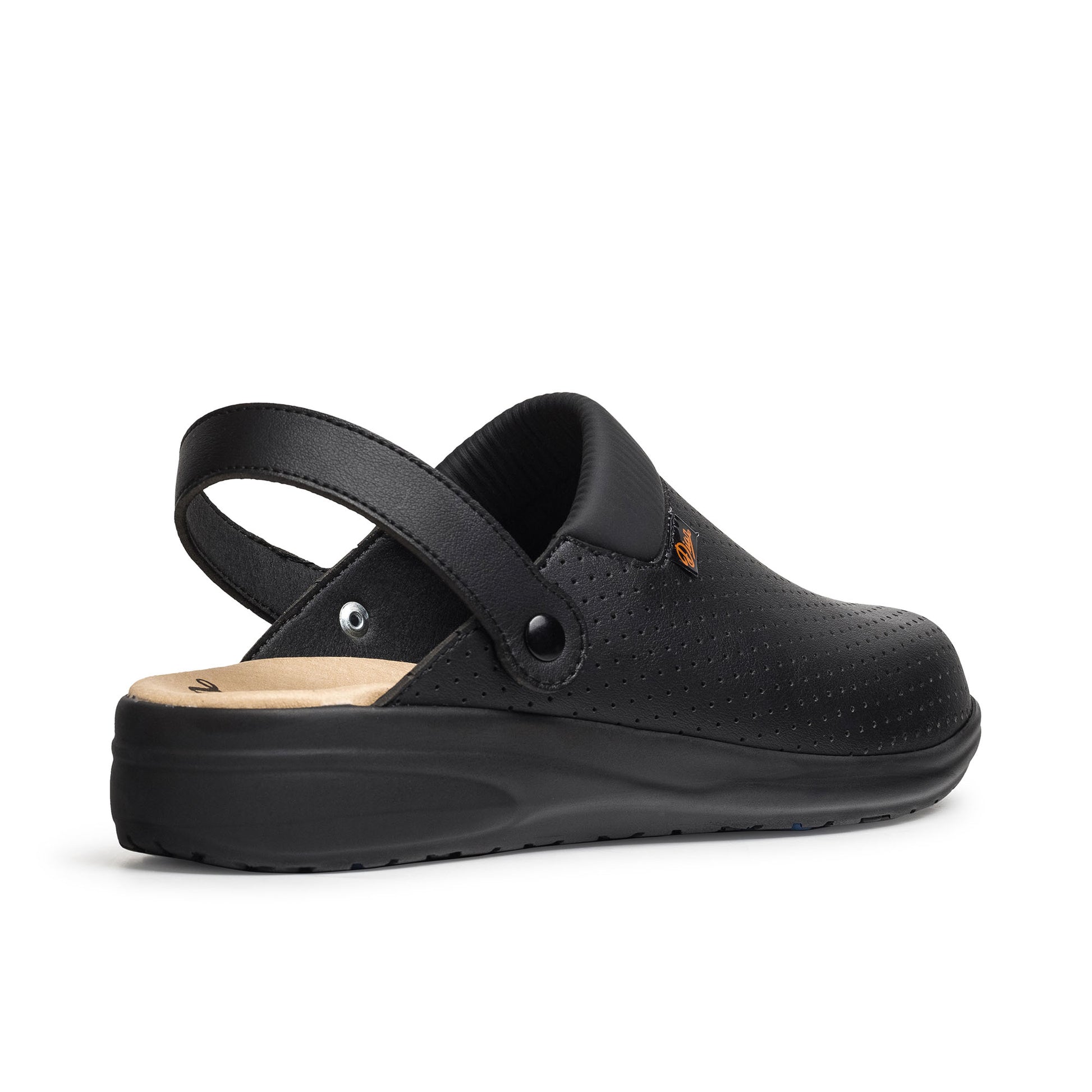 Zueco con correa abatible de sujeción en el talón, fabricado en microfibra técnica transpirable con acolchado en el empeine para evitar rozaduras. Horma recta de puntera redondeada. Plantilla anatómica forrada con microfibra técnica D’COVER OEKO-TEX® y barra metatarsal. Suela de poliuretano en forma de cuña, huella en forma de colmena antideslizante de doble densidad, bicomponente de poliuretano y TPU combinados para aumentar el coeficiente de eficacia antideslizante del zueco. Apto para lavado en frío.